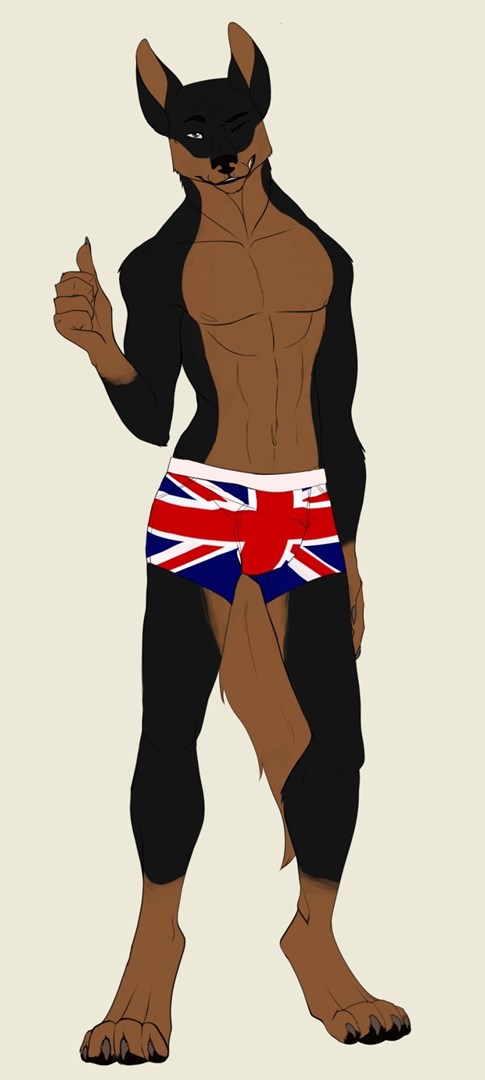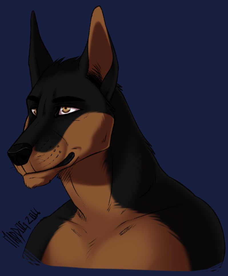 A anthro doberman german shepard dog mix which is a police officer assigned to a case abroad.