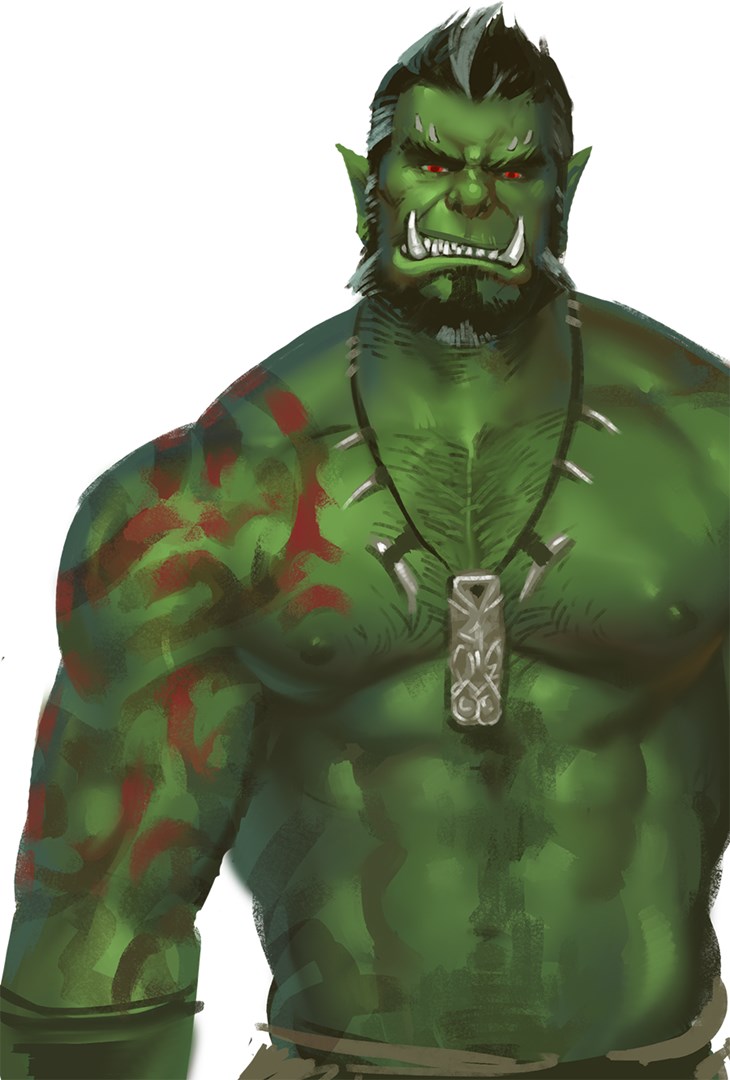 A rough, brutish orc with a hidden softer side.
